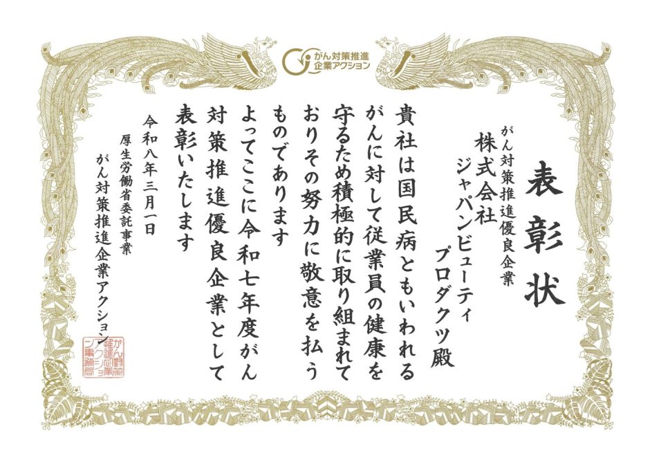 当社は、2026年3月1日付けで、厚生労働省が主導する「がん対策推進企業アクション」において、がん予防知識普及やがん検診受診率向上等の積極的取り組みが評価され2025年度「がん対策推進優良企業」として初めて表彰されました。
